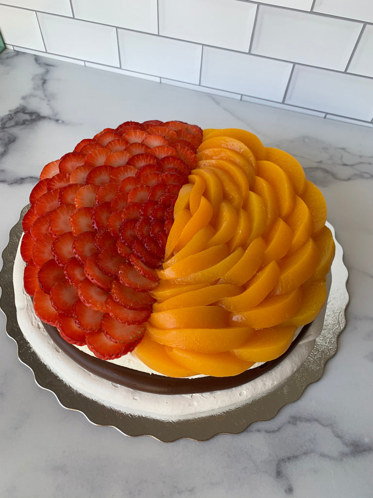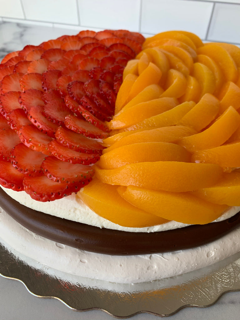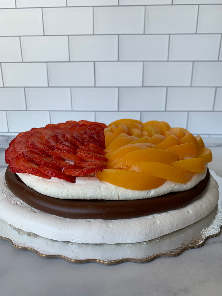 Tarta a base de merengue crocante, rellena de dulce de leche o nutella y cubierta de crema chantillí, fresas y melocotón.