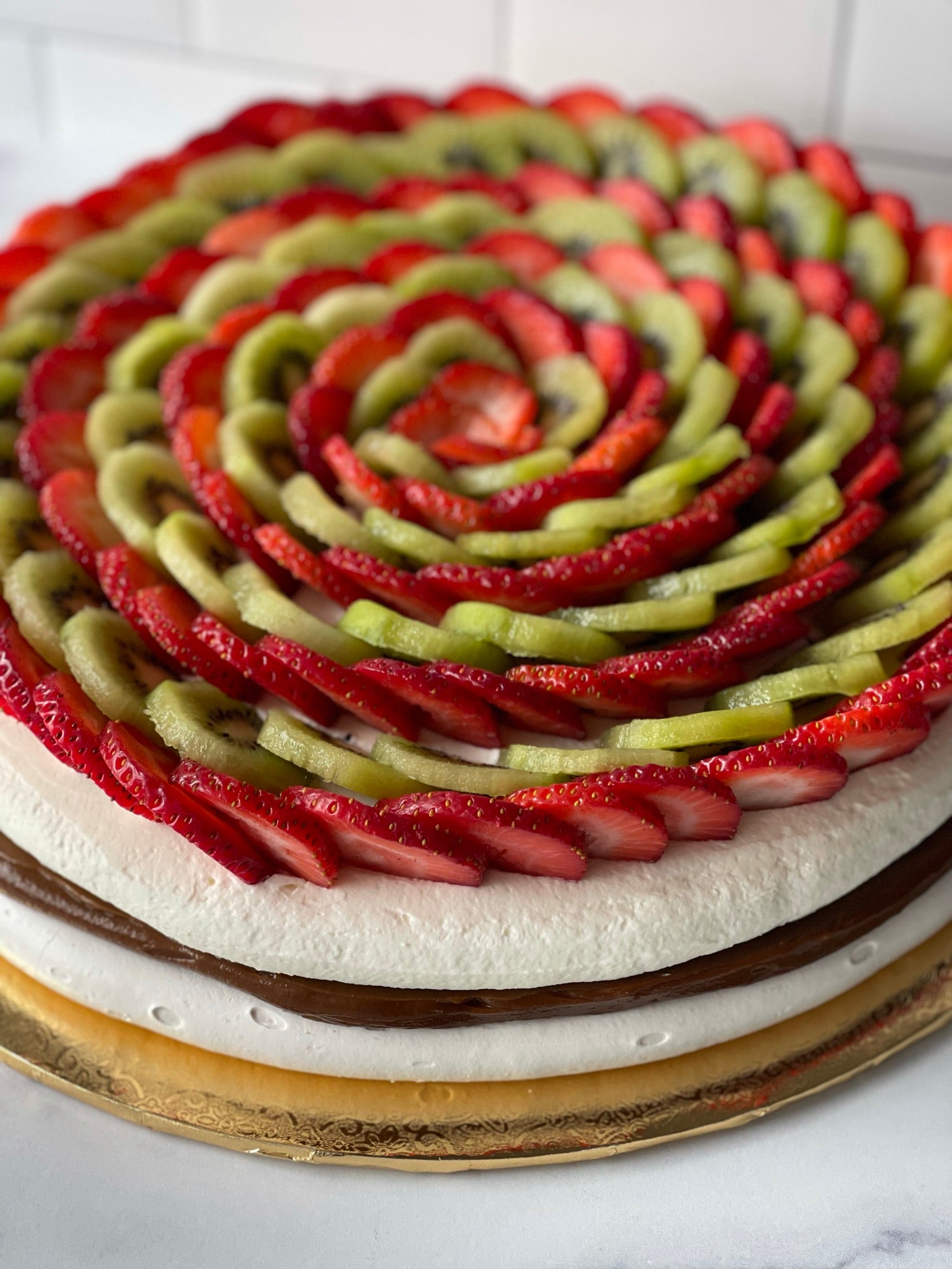 Tarta a base de merengue crocante, rellena de dulce de leche o Nutella y cubierta de crema chantillí y kiwi fresas.