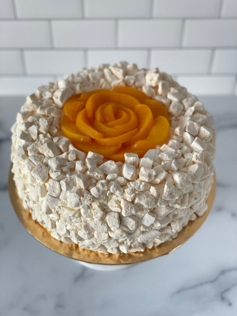 Bizcocho relleno de dulce de leche, crema chantillí, melocotón y trozos de suspiro. Decorada con trozos de suspiro y melocotón.