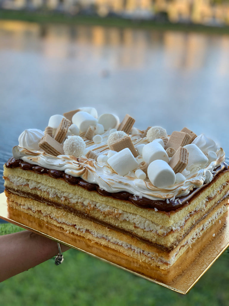 Bizcocho de vainilla relleno de dulce de leche y coco, decorado con merengue suizo y dulces de coco.